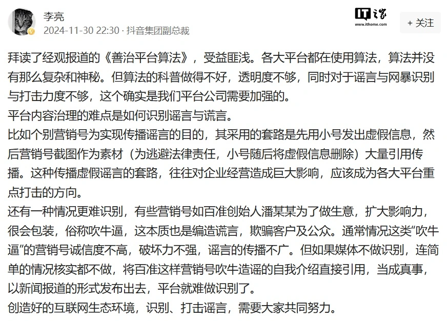 IT之家 12 月 6 日音书,抖音集团副总裁李亮当天再次发文,谈及算法问题,称有网友非难,到底若何惩办算法与集结空话与网暴之间的关连。李亮认为,最佳的主见即是要在根源上惩办,严厉打击谴责者,打击靠挑起对立、煽动网民情谊的营销号,他们这个群体的活动,是集结空话与网暴的根源。