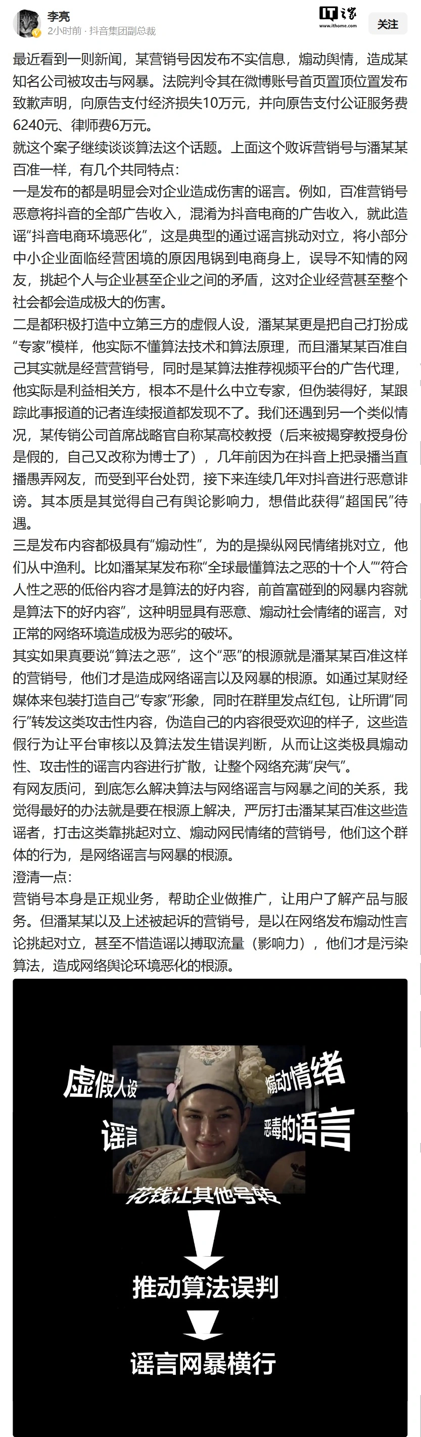 营销号自己是正规业务,匡助企业作念实施,让用户了解居品与做事。但潘某某以及上述被告状的营销号,所以在集结发布煽动性言论挑起对立,致使不吝谴责以搏取流量(影响力),他们才是混浊算法,变成集结公论环境恶化的根源。